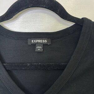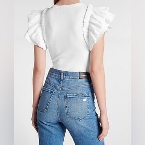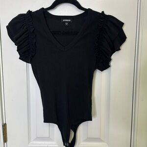 This chic black bodysuit from Express features a fitted design with elegant ruffled cap sleeves, offering a sophisticated touch to your outfit. The sleek silhouette ensures a flattering fit, making it a versatile addition to your wardrobe. Perfect for both casual and formal occasions, this bodysuit is a stylish choice for any event.