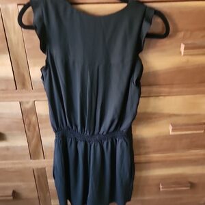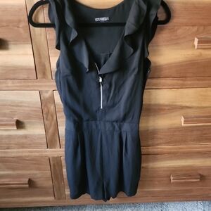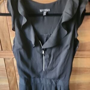 This elegant black jumpsuit from Express features a sophisticated notched collar and cap sleeves, perfect for a cocktail night out. The ruffled and pleated design adds a touch of elegance, while the tailored fit ensures a flattering silhouette. Ideal for making a statement, this jumpsuit combines style and comfort effortlessly.