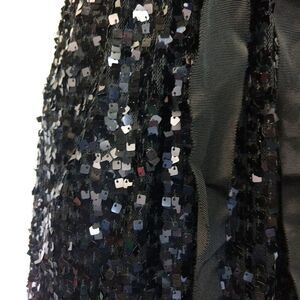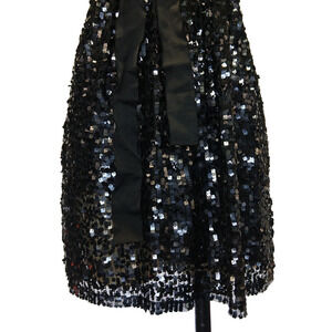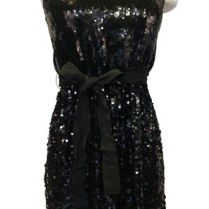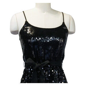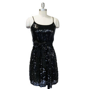 Express black sequin and palette dress with grosgrain tie belt, size extra small. In gently preowned condition, no flaws noted.