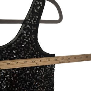 Keywords: Express sequin tank, black sheer cropped top, sparkly party tank, dressy sequin cami, night out crop top, women’s festive top, size XS