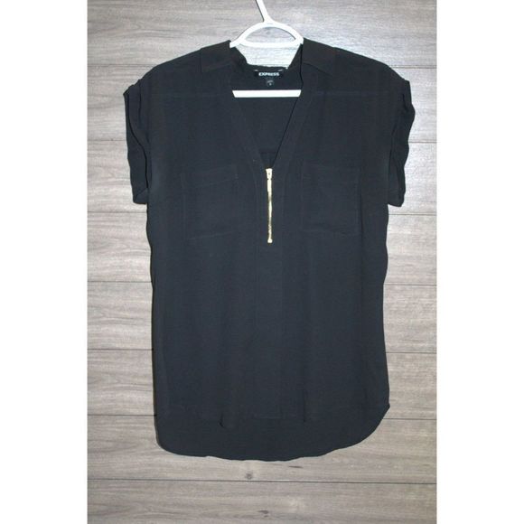 This size small black Express cuffed short sleeve blouse is 100% polyester. Additionally, it has a V-neck, a 1/4 zip with a gold accent zipper, 2 from pockets, and a collar. This pullover is also sheer.