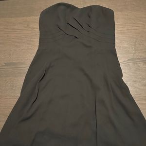 This Express dress features a beautiful black silk in size 2 and fits true-to-size. It has a sweetheart neckline, is strapless, and has gripping at the chest to hold up the dress as well as she boning to give structure. It also has a ruched back to hold up the dress. It has an A-line skirt style and a hidden side-zipper. It is flowy, lightweight, and perfect for any party. This dress was only worn once and is in perfect condition.