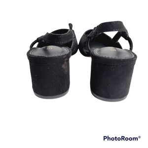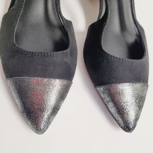 Express black sling back suede texture block heels with a sparkling silver pointed toe cap detail