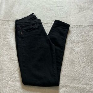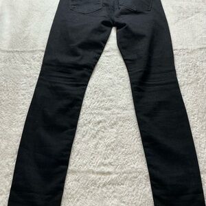 These Express black skinny jeans feature a modern tapered design that complements any wardrobe. The deep black color provides a versatile and timeless appeal, making them suitable for various occasions. Crafted from high-quality denim, they offer both comfort and durability.