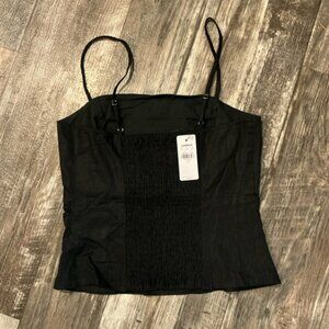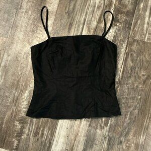 This chic black crop top from Express features a sleeveless bustier design, offering a structured and form-fitting silhouette. The camisole style is enhanced with a tailored construction, ensuring a sleek and stylish look. Perfect for a night out or a fashionable day ensemble.