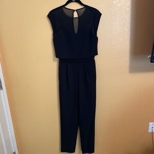 Elegant black jumpsuit. Sleeveless design with mesh detail. Perfect for evening wear.