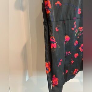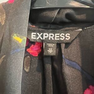 This elegant blouse from Express features a striking black base adorned with vibrant red floral patterns. The sleeveless design and tie front detail make it perfect for warm weather or layering. Its lightweight fabric and v-neckline add a touch of sophistication to any outfit.