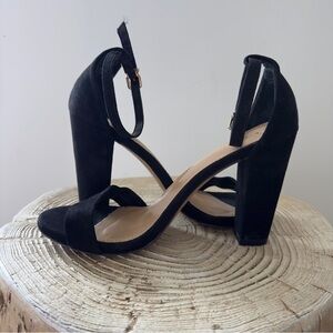 These Express Black Suede Block Women's Heel Sandals Size 8 are gently used but with a ton of life left. Please see pics for signs of wear. These black heels feature a sleek block heel and a minimalist design with two elegant straps. Crafted from a suede-like material, they offer a modern silhouette perfect for formal occasions.