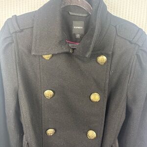 Chic and timeless, this Express black military-style peacoat features a flattering fit with double-breasted gold crest buttons, shoulder epaulets, and a belted waist for added shape. A must-have staple for cold weather or dressing up any winter look.
