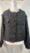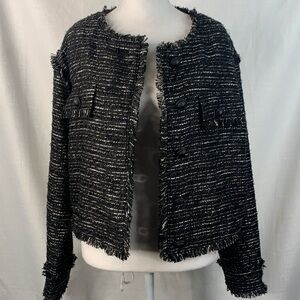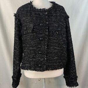 Fun and sassy black tweed blazer! Within the black coloring you will find threads of white, gold, and shiny black threading. The collar, arm, shoulder, bottom and lapel hems all feature a frayed detail for an unexpected look on a buttoned up, polished aesthetic. Crew neckline, bust pockets are for design purposes only; they're non-functional. This looks great paired with black slacks or jeans and works seamlessly from the office to cocktail hour. You can play it safe or go all out with your favotie, over the top gold jewelry! Great classic look that will remain on style for seasons to come.