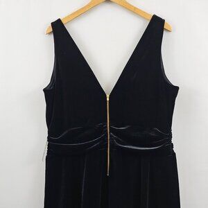 Elegant velvet dress with a flattering fit-and-flare design, deep V-neckline, and gold zipper closure. Ideal for formal or evening wear.