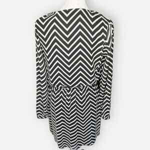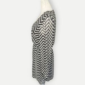 NWT New With Tags Express Black & White Chevron Print Sheer Sleeve Lined V-Neck Long Sleeve Gathered Elastic Waist Wrap Front Mini Dress.