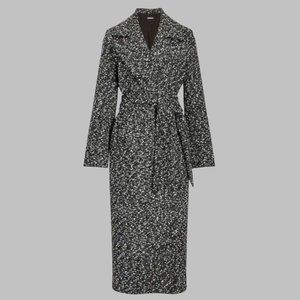 Belted, straight hem, black & white speckled "boucle type" trench coat with notch lapels and open front. Slant hand pockets. Weighs almost 4lbs. Fully lined.