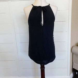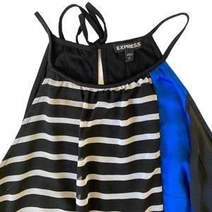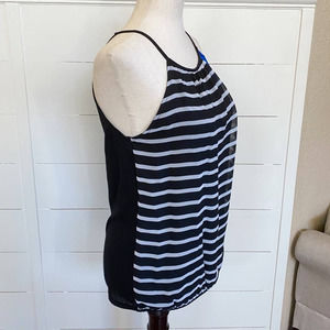 Stylish tank top with black and white stripes. Features a bold blue accent stripe. Perfect for casual wear.