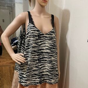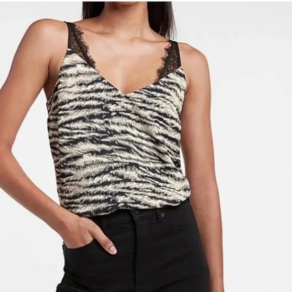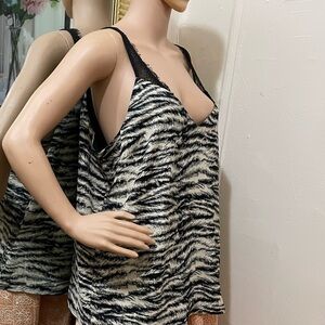 Stylish cami with animal print. Features lace trim. Perfect for versatile wear.