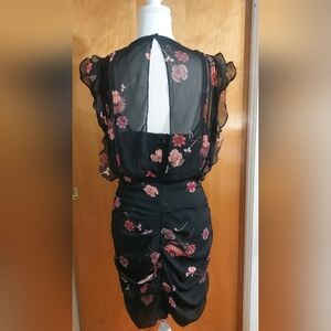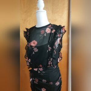 Chic mini dress with pink floral design. Sheer ruffle sleeves. Ideal for stylish outings.