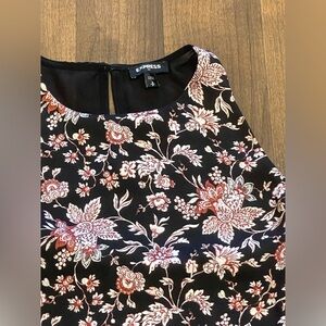 This sleeveless tank top from Express showcases a delicate floral pattern in black and pink, exuding a romantic yet casual vibe. Its flowing silhouette and rounded neckline make it a versatile piece for various occasions.