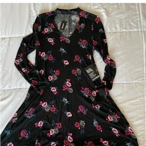 This chic sundress from Express features a striking black base adorned with delicate pink floral prints. Designed with a flattering V-neckline and long sleeves, it offers a relaxed fit perfect for a night out or casual gatherings. The soft, flowing fabric ensures comfort and style, making it a versatile addition to your wardrobe.