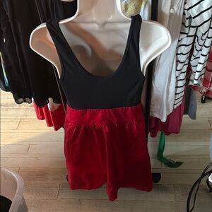 Chic mini dress with a bold red skirt and sleek black top. Ideal for stylish outings.
