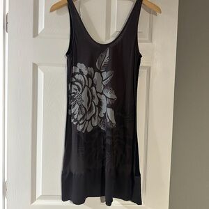 Chic mini dress with floral pattern. Black base with silver accents. Perfect for a night out.