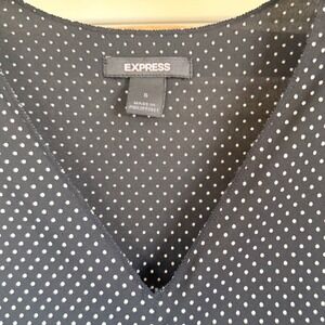 Keywords: Express, polka dot dress, sheath dress, midi dress, sleeveless dress, black dress, white dress, bodycon dress, party dress, cocktail dress, women's dress, career dress, work dress