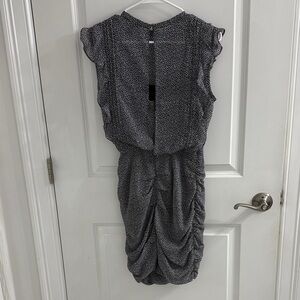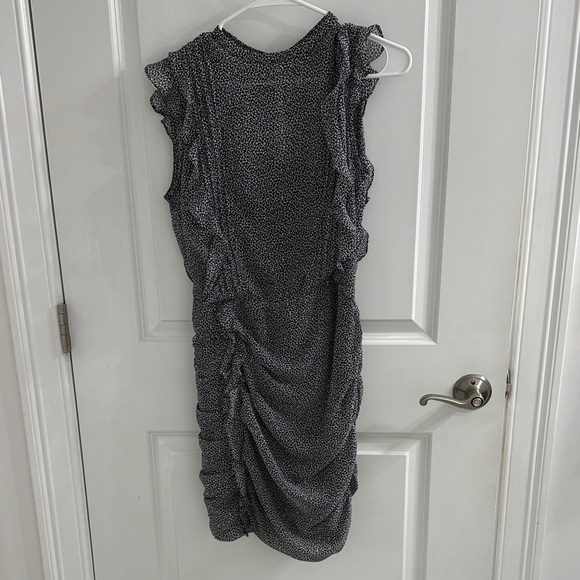 Chic midi dress with playful ruffles. Black and white pattern adds elegance. Ideal for versatile styling.