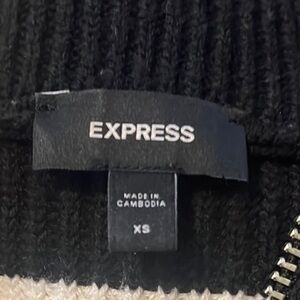 Stylish black and white striped sweater. Features a half-zip front. Perfect for casual wear.