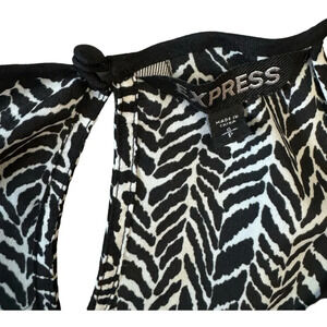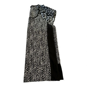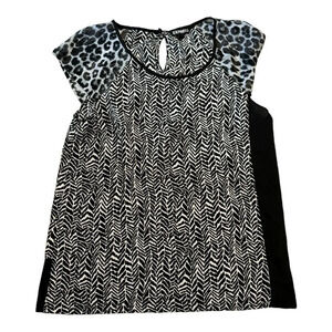 Black and white chevron-like print on the majority, black and gray animal print on the cap sleeves, and a plain black vertical panel on the left size, black lining at the scoop neck, and a cute little keyhole in the back with a small black button.
