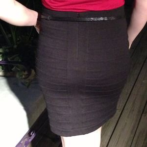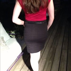 This outfit was bought for a photo shoot and we didn't use it. Both items are for sale and, yes, I will bundle. ;) Classic black bandage skirt comes back every year. 18" long, high waist, and very body conscious. The stitching is SO fantastic. Or, more simply put- it makes your butt look awesome! 72% rayon, 23% nylon, 5% spandex. Buy the top AND skirt for $65. Belt not included.