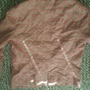 Pink stitching on a taupe background. There is some padding in the shoulders. Buttons on the sleeves. Size 4