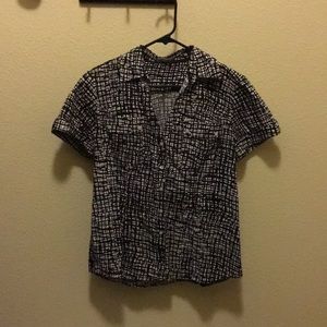 Black and white Express Design Studios blouse with collar and two front pockets. Comfortable and great for work