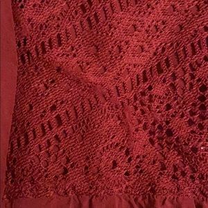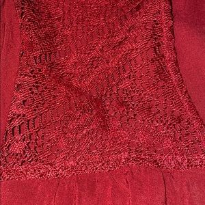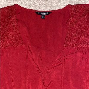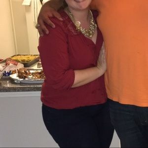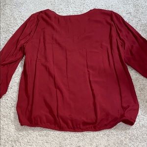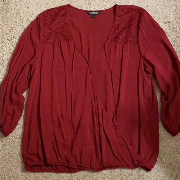 Dark red/maroon blouse with elastic sleeves and bottom, and lace detail near the neck. This blouse also has a very flattering v neckline and faux wrap.