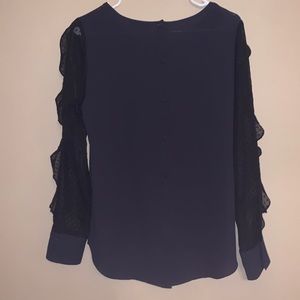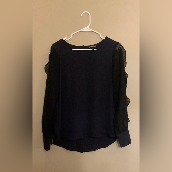 Express long-sleeve blouse. Size small. Color looks most accurate in last picture, more of a navy blue. Portofino shirt with sheer polka-dot and ruffle sleeves. Back has buttons down the middle.