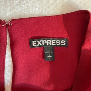 Express size Large. Typically Express runs on the smaller or more fitted side, and this piece is definitely form fitting. Anyone who typically wears a size Med/Lrg would be able to comfortably wear this top. The fabric on the sleeves is sheer, but the main shirt is double layered so it is not see through. This professional blouse is very flattering, and will be perfect to wear to the office!