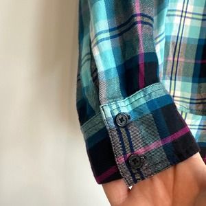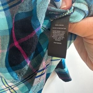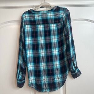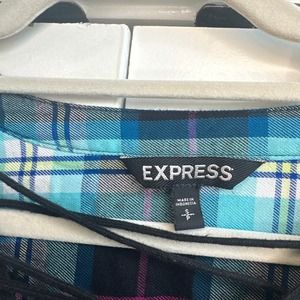 Express Blue, Black, and Pink Plaid Lace Up Long sleeves Hi-Low Blouse