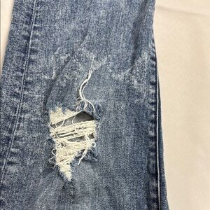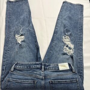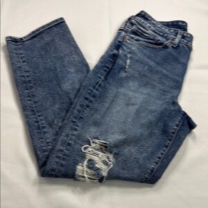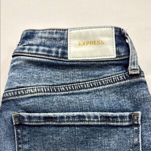 These Express boyfriend jeans offer a relaxed fit with a medium wash, perfect for a laid-back, everyday style. The blue denim features subtle fading and whiskering for a slightly worn-in look, making them a versatile addition to any casual wardrobe.