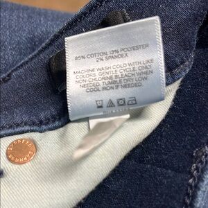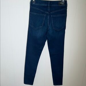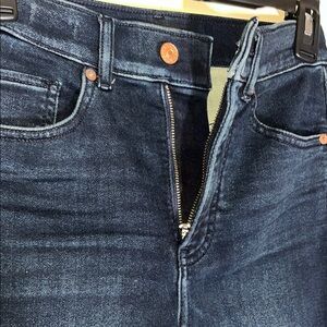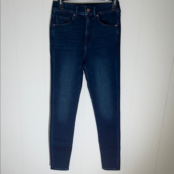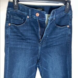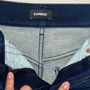 These Express jeans feature a classic dark blue denim color with a high rise fit. The slim silhouette tapers towards the ankle, providing a sleek and modern look. The clean wash and traditional stitching enhance their timeless appeal.