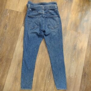These blue skinny jeans from Express feature a high-waisted design with a paper bag waist and a matching denim belt. The slim fit tapers down the legs for a modern and sleek silhouette.