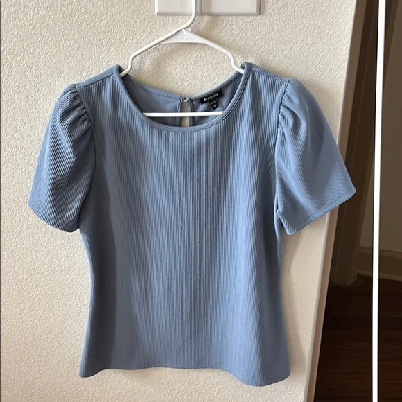 This stylish top from Express features a ribbed texture and a silhouette, perfect for a chic and modern look. The blouse is crafted in a beautiful blue hue, with a rounded neckline and slightly puffed sleeves for added elegance. Ideal for both casual and dressy occasions, this blouse is a versatile addition to any wardrobe.