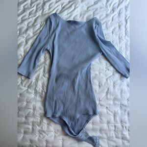 Stylish light blue ribbed bodysuit with long sleeves. Perfect for layering or wearing alone.