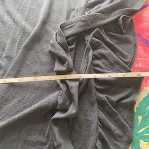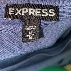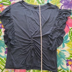 Dusty blue ruffle Express top, size medium. This top laces up at the waist and can be tied into a bow. The fabric shows some signs of wear/wash but the condition is fair overall. It is very comfortable and is great for dressing up or down.