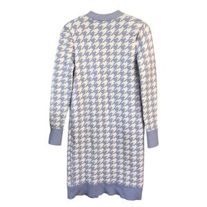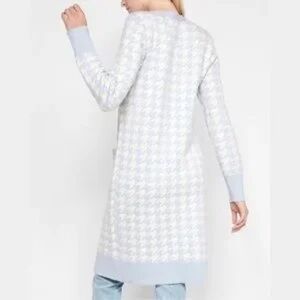 This beautiful duster cardigan by Express is perfect for any season, with its heavyweight fabric and stretchy material. The cardigan features an open front and long sleeves with shoulder pads, giving it a stylish yet comfortable look. The blue and white geometric pattern adds a pop of color, making it a great addition to any wardrobe.