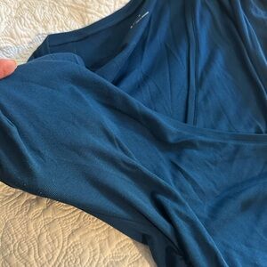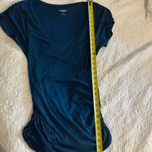 This chic blue blouse from Express features a flattering wrap design with ruched detailing, perfect for adding a touch of elegance to your wardrobe. The short sleeves and fitted silhouette ensure a comfortable and stylish fit, making it an ideal choice for any occasion.