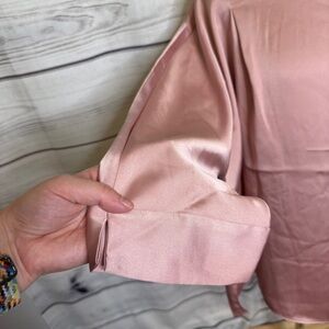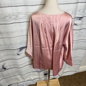Chic satin blouse with a soft sheen. Features a relaxed fit and elegant design. Ideal for versatile styling. Boat neck and 3/4 length sleeves.