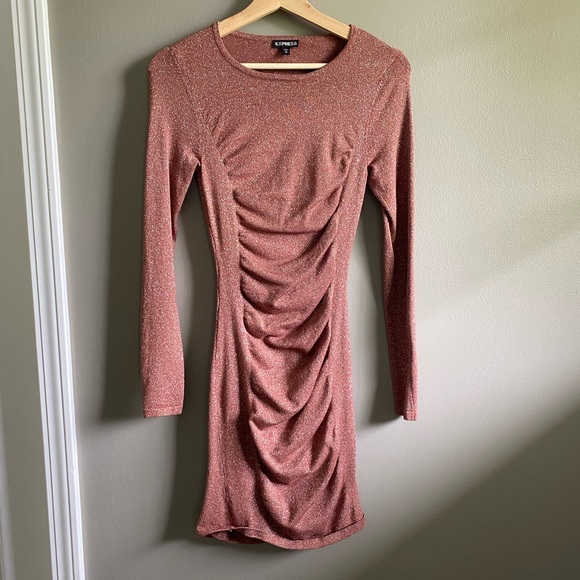 Express long sleeved bodycon dress. Pink stretchy fabric with silver metallic thread. Ruching down the middle on both front and back. XS.