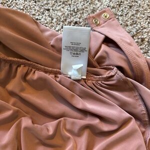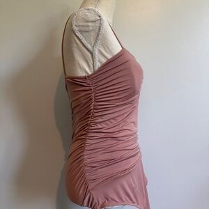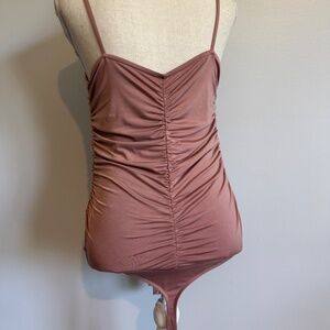 Contour bodysuit from Express, size Large. Blush/nude in color, very flattering with all the touching on the front from the breasts through the belly area. I never even wore it once and now it doesn't fit anymore. Snap crotch closure, thong back. Measures 16 inches pit to pit, 13.5 inches across the waist. Very stretchy with removable cups.