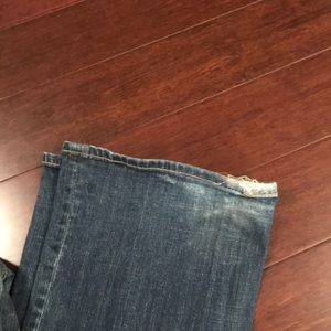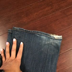 Super comfy Express jeans size 6. Typical blue jean color with a natural fade look. One of my favorite pair of casual jeans! No problems except for a little wear (shown in pics) in the heel.