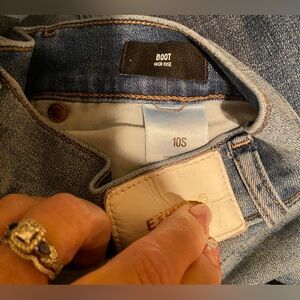 High rise. Rise: 11 inches. Light Blue. Lightly distressed. Size 10 short. Inseam: 30 inches. Worn only 1 time. Like New.