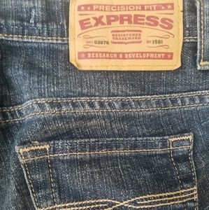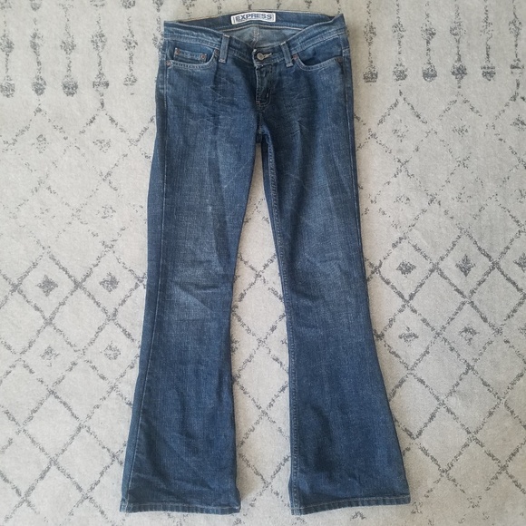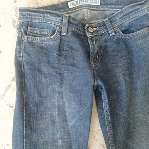 Express stretch bootcut Jeans. Size 4 regular length. Some distressing and wear, shown in photographs. Used condition is reflected in the price.