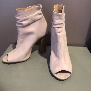Express open-toed booties! Suede grey with a brown heel.